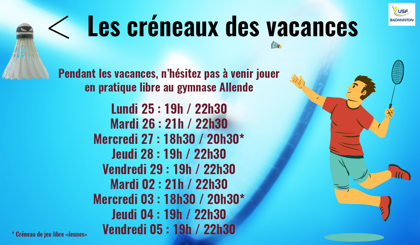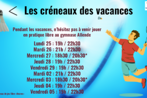 Des envies de bad pendant les vacances scolaires ? Pas de problème, voici tous nos créneaux de pratiques libres (pensez à prendre vos volants).Les mercredis sont également ouverts aux jeunes du Lundi (minimes, cadets, juniors et compétiteurs jeunes).